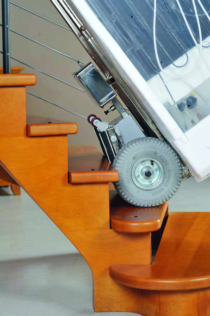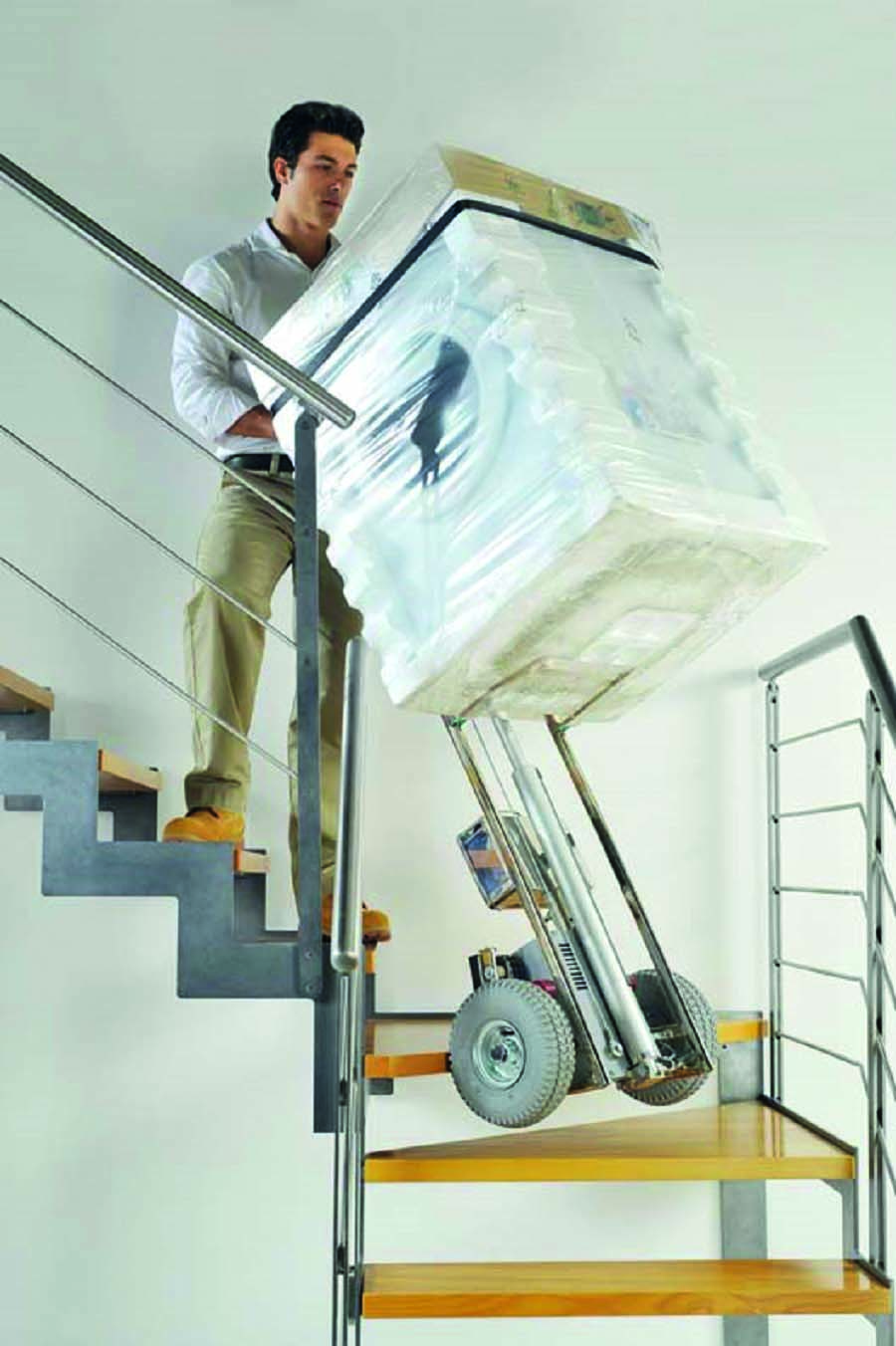 Beide Geräte sind mit pneumatischen, bodenschonenden Rädern ausgestattet und überwinden bis zu 28 cm hohe Stufen. Die Stützfüße werden beim Auf- und Abstieg automatisch positioniert. Dank der „Soft touch“-Technologie lassen sich Güter über Treppen jeder Art transportieren: Die Stützfüße erkennen automatisch das Aufstehen auf der Stufe und verringern die Geschwindigkeit, so dass Gerät und Last beim Übergang von einer Stufe zur anderen sanft aufsetzen. Der Auf- und Abstiegsmechanismus greift immer 5 cm weit von der Stufenkante entfernt, wodurch das Abrutschen sowie Beschädigungen verhindert werden. Gewichtssensoren sorgen beim Abstieg für eine automatische und sichere Steuerung.