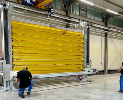 Im Juli 2025 hat Bartels seinen neuen Automatic-Tower erstmals bei einem Kunden installiert. Am Stammsitz der Gräper Gruppe in Ahlhorn bei Bremen wurde die vollautomatische Regallösung in einer maßgeschneiderten Version für Langgut aufgebaut. Und das in Rekordzeit. Der Aufbau der Stahlkonstruktion, die Verlegung von Kettenzügen und Kabeln, die Installation von Schaltschrank und Bedienpanel sowie die technische Abnahme und Inbetriebnahme erforderten lediglich zweieinhalb Arbeitstage.