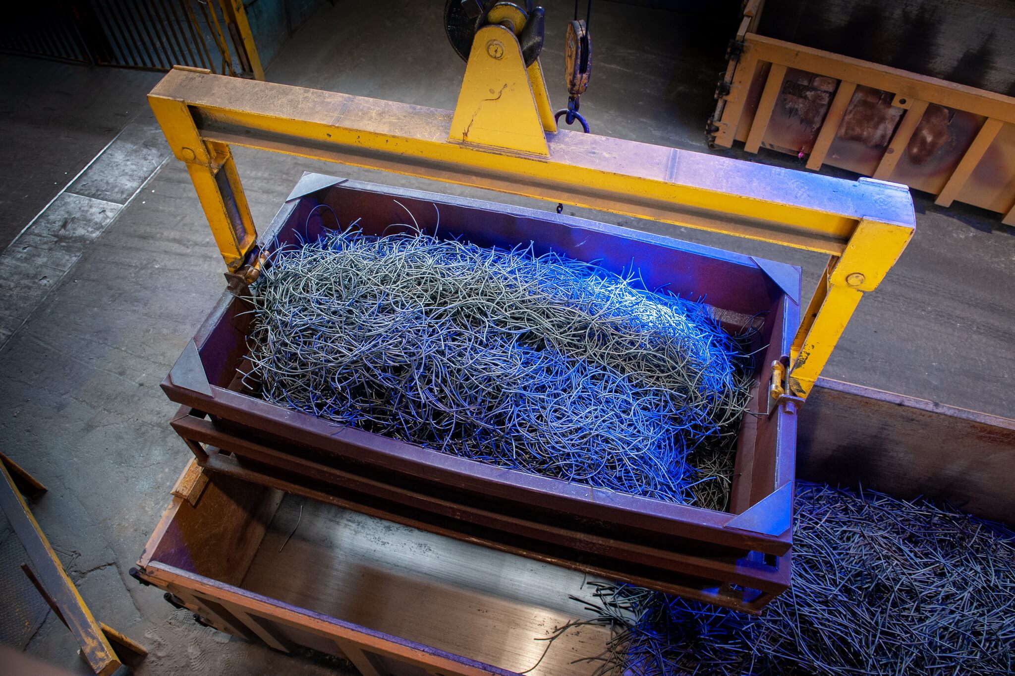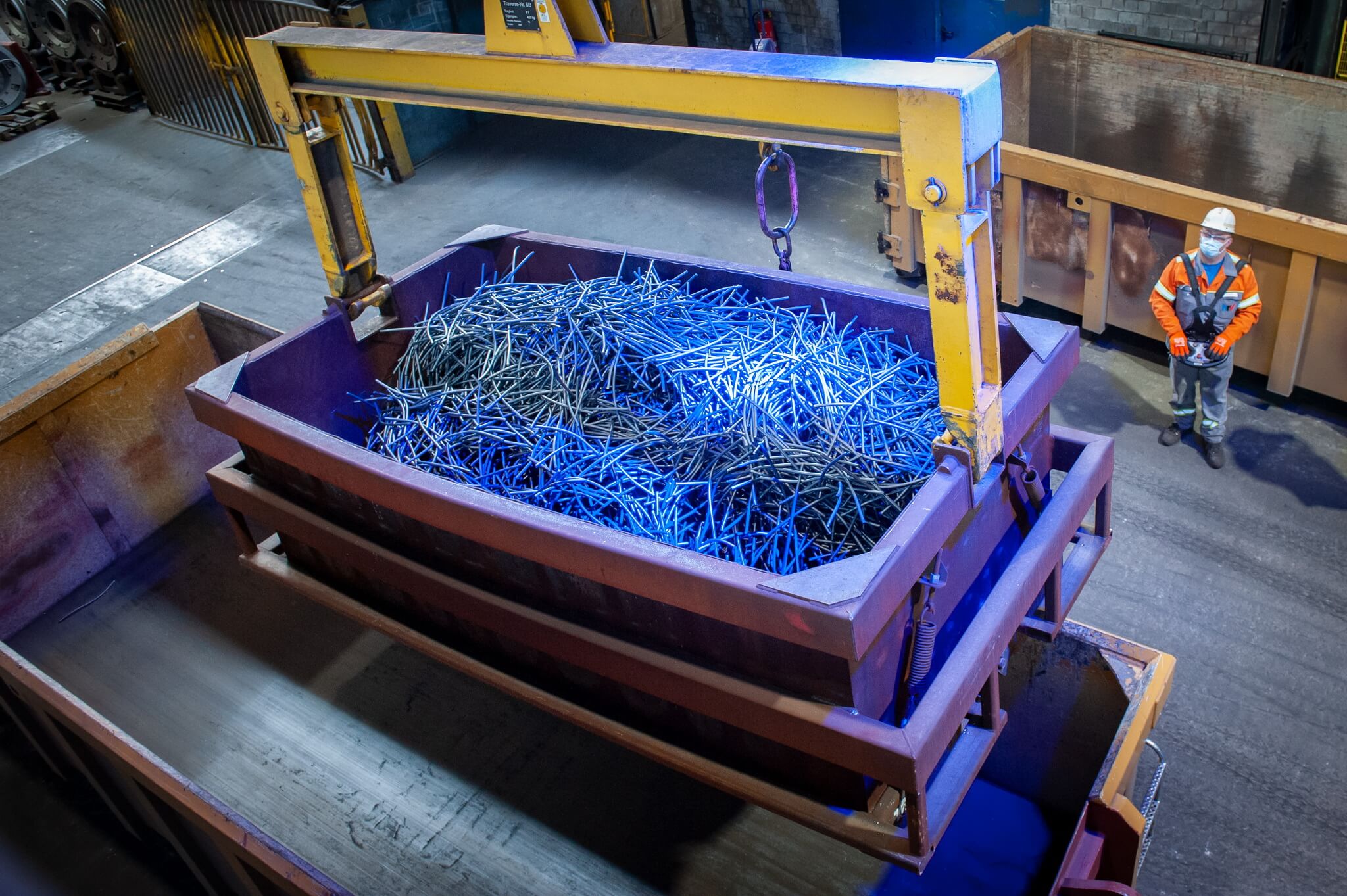 So geht es an diesem Tag im April 2021, abgesehen vom ohrenbetäubenden Lärm der Maschinen, denn auch recht gemächlich im Walzwerk zu. Nur manchmal schaut ein Mitarbeiter in Schutzausrüstung nach dem Füllstand der Bodenklappenbehälter. Als der Behälter mal wieder so voll ist, dass schon einzelne Drähte auf dem Boden landen, kümmert er sich um die Entleerung. Die Luft über dem Behälter flimmert aufgrund des heißen Inhalts. Zunächst leitet er den Trichter um, aus dem die noch glühenden Drahtenden fallen, so dass ein bereitstehender leerer Behälter zum Einsatz kommt und die Produktion nahtlos weiterlaufen kann. Dann verteilt er die Abfälle mit einem zweizinkigen Schürhaken gleichmäßig im Behälter und schaufelt die daneben gefallenen Drahtenden hinein. Schließlich schnallt er sich die Funksteuerung des Brückenkrans um und fährt den Behälter zu dem 30 Kubikmeter-Container, der am Halleneingang steht. Er senkt den Behälter hinein und löst mit dem Nebenhub des Krans den Öffnungsmechanismus des Behälters aus. Mit einem Rumms fällt der Inhalt in den Sammelcontainer. Dann fährt er den Bodenklappenbehälter wieder hoch und lässt ihn neben dem Container aufsetzen, so dass der Boden wieder verschlossen wird, bevor er ihn zu seinem Standort zurück fährt. Nach nicht einmal 10 Minuten steht der Bodenklappenbehälter wieder an der Maschine.